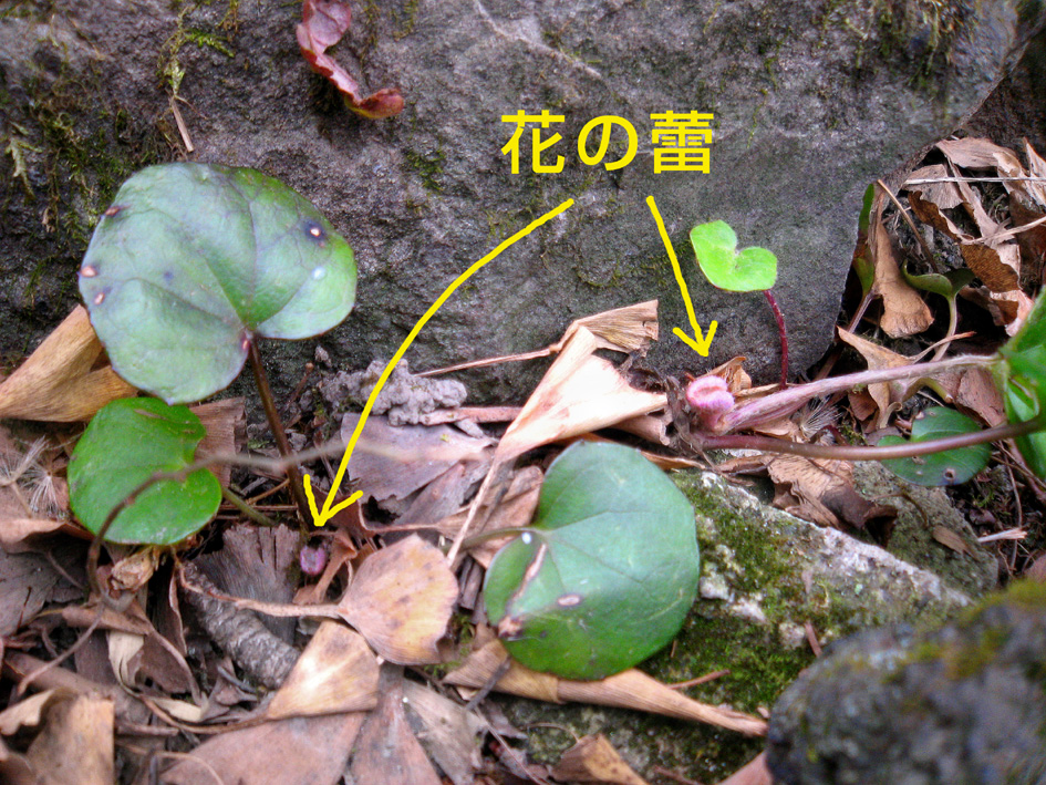 貴重な植物だそうです。富士塚のボク石の間に発見したその人は、とても驚いていました。落ち葉をかき分けると、ピンクがかった小さな花の蕾があちらこちらに見えました。