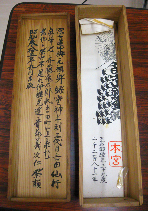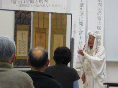 先日、色々な方たちと知り合いになれました♪ その中で、富士吉田の御師宅を紹介する活動をされていて、富士山にも富士山信仰にも詳しく、お話も楽しい素敵なK様からかわいいポストカードが届きました。嬉しかったので、アップします。 富士吉田では雪が降っているとのこと、現地ではこんな姿の富士山も拝めるかと、三好和義さんの「時の魁(富士吉田)」をバックにして撮ってみました。切手も富士山でした。ありがとうございました。そうそう、私の本も読んでくださったとのことで感謝いたします。 お会いしたのは、めぐろ歴史資料館のめぐろ・れきし講座にて。2部構成でとても濃い充実した内容でしたので、寝不足のアタマもすっきり(これは珍しい♪)。1部はまたゆっくり書きますが、2部はこちら。 神奈川県にある富士講、横須賀丸伊講社の先達の講義。45回も登山なさっている5代目です。これは、御三幅(ごさんぷく)の解説をされているところ。この前で手刀を斬った時、それが鮮やかだったので、受講者全員くぎ付けになりました。 御三幅は、富士講にとっての神様。富士山に登る時にはこの「御身抜(おみぬき)箱」に入れ、山頂で開いて息を吸わせるとのことです。 お焚き上げ(角行像の御開帳の時)の貴重なビデオも拝見しました。貴重すぎる画像はひかえますが、こうして富士山の形に焚いた火で吉凶を占ったりする場面、迫力ありますね。 そのほか、頭の宝冠(ほうかん)は7尺2寸の長さですが、「命づな」であるというご説明。2本つなぐと、ほぼ1反の長さになるので、何かあったらこれを解き、人をおぶったりひっぱったりするのに使えます。また、杖は、雨具としても使う菰(こも)と組み合わせて、担架にもなる。鈴は、他の講の方からも聞いていた「くまよけ」の呼び名が。実際富士山の麓では熊が出ていたのでしょうし、濃霧の中を行く時に使われる。などなど、たっぷりと興味深いお話が続きました。気さくで魅力的なお人で、とても楽しかったです。 それにしても、先達という方たちは存在感が大きい。オーラが違う。このオーラ分析(?)はいつかやってみたいと思ってます〜♪