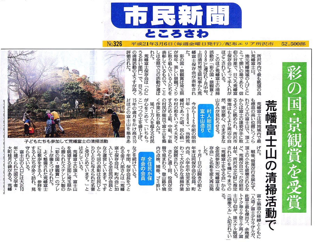 ソフトが不調だと思ったら今度はハードが不調で、しばらく途方にくれておりました。再起動を繰り返しながら、しかたがないのでその間、オブジェに手を入れたりしていました。 やっと修復できたら日付が変わっています。まあ、できるところから。 たいぶ日がたってしまいましたが、先日の「荒幡富士」。 昨年は本の取材でお話をうかがい、今年2月にはNHKの番組に一緒に出ていただき、お世話になりっぱなしの荒幡富士保存会会長の金子さんにこの日もお世話になりました。いきものふれあいセンターのスタッフや地元の方、近隣からいらした方と一緒に登拝いたしました。 この季節、ツツジとヤマツツジがとても美しかったです。 塚に関する新しいお話もた〜くさん聞けました。(くわしくは後日) 本当にありがとうございました。 頂上では、展望図の看板が新しくなっていました。そう言えば、2月、番組の収録に訪れた際、「これはもう10年くらい経っていて古いんですよ。もう変えなくちゃ」とおっしゃっていました。収録の直後に作り変えたのだそうです。 看板の下のところにつけられているのが「彩の国・景観賞2008」のプレート。2月12日に金子さんたち保存会と地域の方たちが埼玉県知事から表彰されました。 3月、受賞に関する新聞記事をいただいていたので、ブログで紹介したいと思っていました。(この他にも記事はありますが) 今年度で22回目を迎えたこの賞は、「たてもの・まちなみ部門」のほか、住民が主体となったまちづくり活動や、良好な景観を守り育てる活動が対象となる「心のうるおい部門」があり、保存会が中心となって続けている「荒幡富士の清掃活動」が、後者の部門で受賞されました。おめでとうございます。 でも、年に2回、保存会と地域ボランティアが荒幡富士を清掃するのは知っていましたが、おそらくそれだけではこんなに綺麗には保てないと思います。この富士山を愛し、いつも手入れを怠らない方たちの努力があってこそこんなに清々しい場所となったのでしょう。 清掃するということは「お浄め」でもあり、そこに神様も降りて来る。立派な聖地ですね。山は有り難い姿で訪れる人を迎え、そこに立てば人も気持ちいいと感じる。(私が好きな竹富島が「神高い」のも、島の人が早朝から道を掃き浄めたりして、清掃を続けているからだと気づきました♪) さて、昨日、金子さんから連絡がありました。今年の夏の清掃には、子供たちのボランティアが増え、なんと総勢200人でやることになったそうです。また、最近荒幡富士が注目されていて、訪れる人も増えているとのことです。本当に有り難いことですね。私も嬉しいと同時に、地域の方たちと交流を持てることに、心から感謝しております。 ちなみに清掃日は6月14日です。登拝の状況はよくわかりませんが、その日を狙って行かれるのもいいかもしれませんね。いつもとは違うお山の姿を感じられるかもしれません。 ★★★★★★★★★★★★★★★★★★★★★★★★