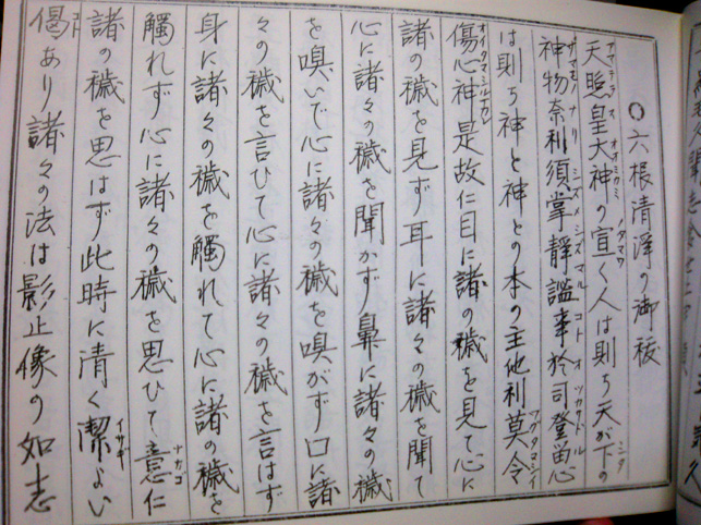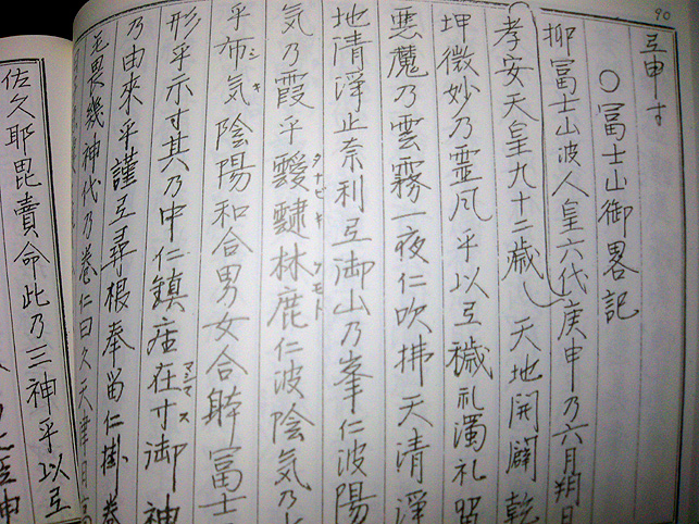 今年の品川富士のお山開きは、7月5日でした。 昨年の感動を再び!と思いつつ、当日は朝8時からのお掃除どころか11時からの儀式にも間に合いそうになかったので、泣く泣く断念いたしました。 この素晴らしい御神体を拝むことができず、本当に残念でした。 行かれた方はいますか? 昨年、講の方たちにまじって読ませていただいた「お伝え」は、目で追うだけでも大変でした。でも、言霊は確かに波動のパワーがあり、声や鈴(レイ)の音は、その場を浄め、人に感動を与えるものでした。 先達さんが解説してくださったことも貴重なことでした。 品川丸嘉講では、昭和63年から使っていたお伝えに代わり、昨年新しく作り変えました。そんなこともあり、古いほうを一冊くださいました。(嬉しかったです。感謝しきれません!) ほんのちょっとだけですが、アップします。先代の先達が作られたお伝えです。 横長に綴じられたお伝えの最初のページ。 富士山がいつどのように「出現」したかが出ています。 六根清浄の御祓はこんなです。他には、加持祝詞なども含まれていて興味深いです。神道の部分、仏教の部分もいろいろ。 お伝えは、お題目をはじめとして基本は同じですが、各講によってだいぶ違います。講がたどった歴史も違うし(教派神道の傘下にあった時期もあり)、加えられる内容もさまざまです。 同じ丸嘉講でも清瀬市中里講では、こんな感じ。 いずれにしろ、読誦する声を聞けたらそれはとてもありがたいことですね。最近つくづく思います。文字のパワー!言霊パワー!