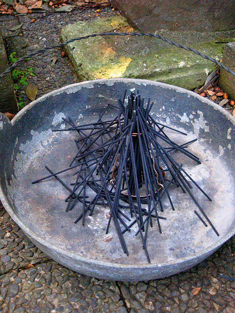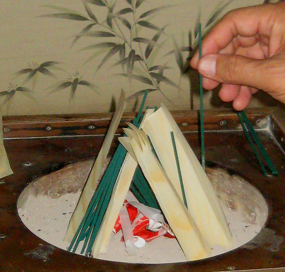 このカタチ。 はい。富士山です。 火鉢(これも拝み箪笥と呼べるのでしょうか)の中で、富士山の形に線香を立てます。 こちらでは、細く切った経木を支えに使ってますが、 このように線香のみで立てることも多いです。 ↓ このカテゴリー内 ちなみに、メタル富士の骨格はこれにも通じるのでした。 つづく。。。