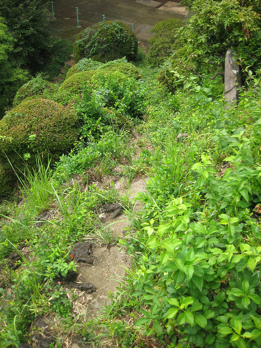 巨大な塚を見上げ、思わず深呼吸をしたりする。 正面の麓にある笹竹は、 8月1日のお山開きで御三幅(ごさんぷく)を吊り下げるために設置したもの。 →当日はこうして掲げて拝みます。 笹竹は、簡易鳥居のようでもあります。つまり、その向こう側が神域ということ。 今回は、正面から登らずに、違うトレイルを行ってみます。 塚の左側からはじまる、中腹まで一直線の白い道。近年見つけた「須走口」です。 中腹から見下ろしたところ。登りやすそうだけど、結構な勾配で、 よろけるとたちまち滑落しそう。そんなスリルも悪くない。 この大泉富士は、私が富士塚と認識する前からよく登っていたお富士さん。 おそらく100回は登っている、まさにご近所富士であります。 それでも、訪れるたびに新発見があるというもの。 前回の発見はこの須走トレイルでしたが、今回もすごかった。 つづく。。。 Facebook あり〼