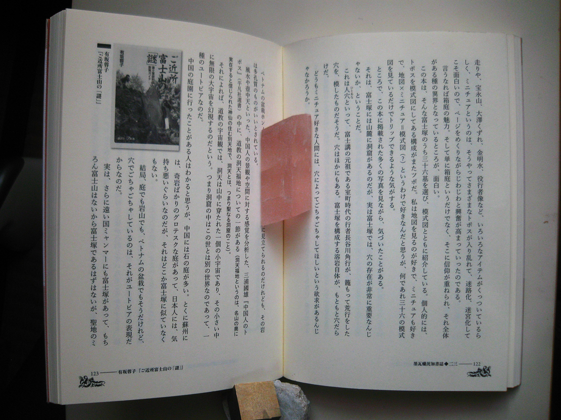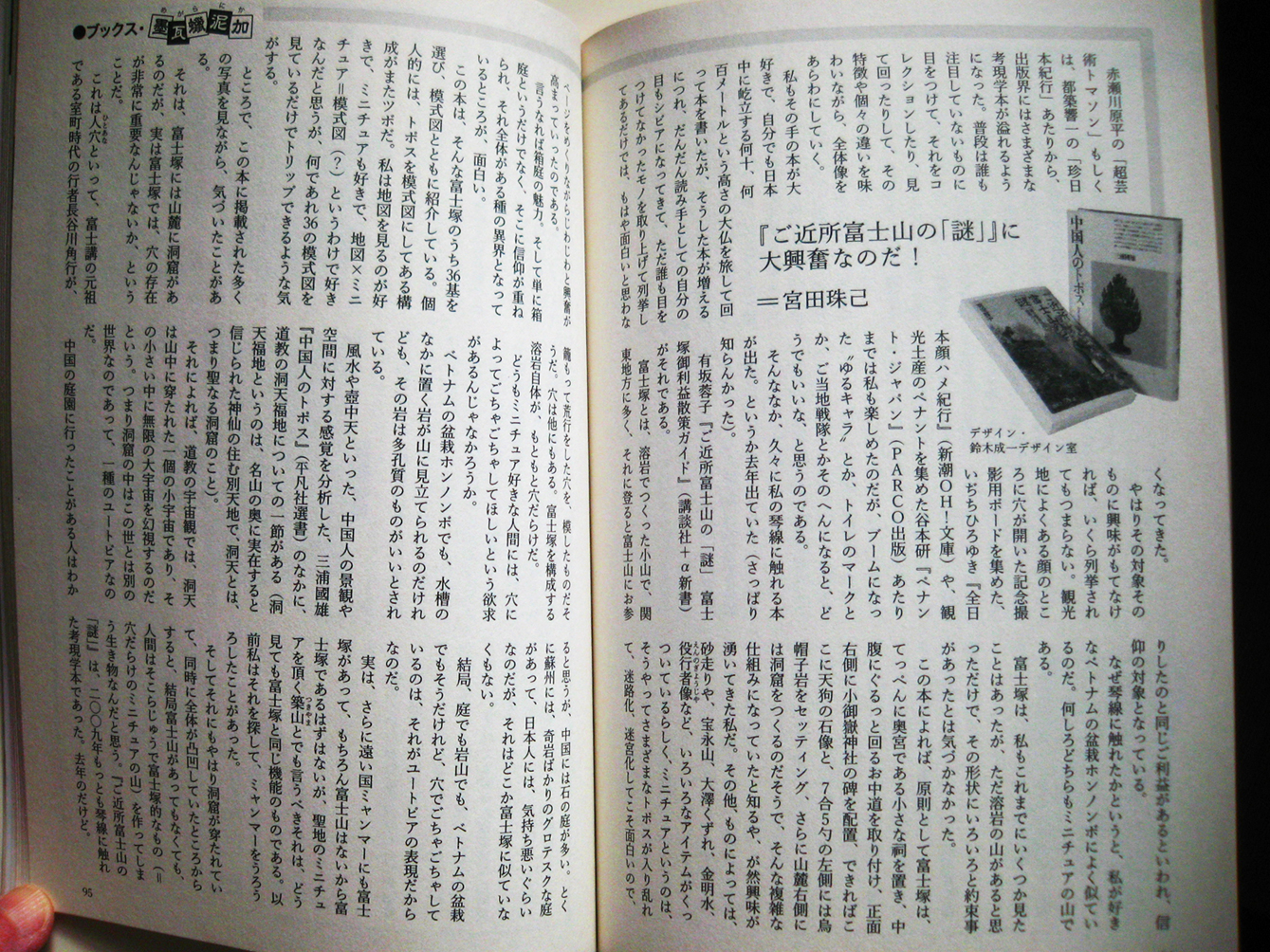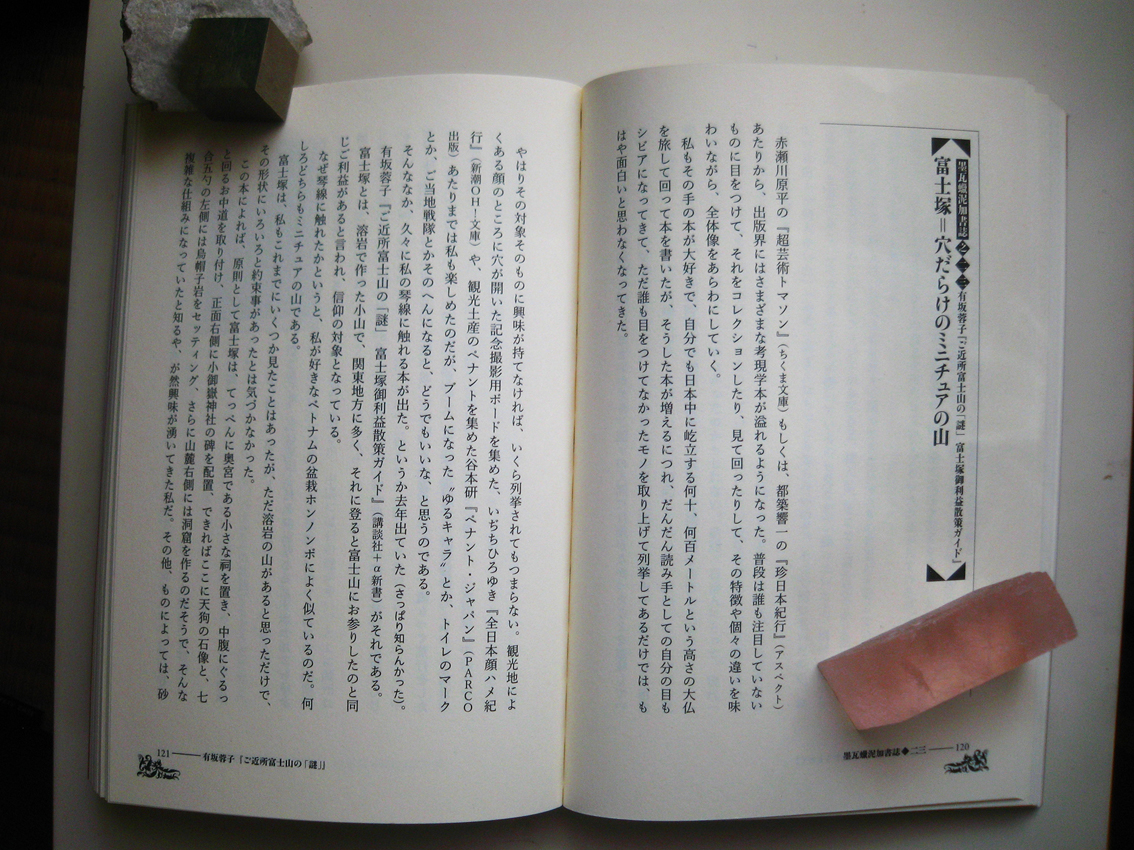 ちょうど4か月前に出版されたというこの本。 「はるか南の海のかなたに愉快な本の大陸がある 墨瓦蝋泥加書誌 (ブックス・メガラニカ)」 本の雑誌社刊 宮田珠己著 昨日のことです。ふとしたことから、私の前著が紹介されているのを知りました。 有り難いですけど、なぜ前の本を??? まあ、先月の朝日新聞に前著が掲載された(再読コーナー)こともあるから、 新刊本でなくてもいいのかしら?と思って読んでみたら、 【 富士塚=穴だらけのミニチュアの山 】というタイトルで、 「ご近所富士山の謎」について書かれてあり、こんなくだりが。 「去年出ていた(さっぱり知らんかった)」 え、去年? 「ご近所富士山の謎」は2008年に出ましたが??? と思って、前書きをよく読んでみたら、 この本は、宮田さんが「本の雑誌」という月刊誌(この雑誌は知っていたけど)に 連載している「ブックス・墨瓦蝋泥加」という記事をまとめたものとわかりました。 なるほどなるほど。そういうことか! だから最近の内容ではなかったのね。 彼が2010年に「(ご近所富士の謎の刊行を)さっぱり知らんかった」ように、 私も2011年に「(その記事を)さっぱり知らんかった」わけです。 にしても、この著者名をどこかで聞いたことがある気がしました。 プロフィールに「ふしぎな盆栽ホンノンボ」というのがある。 あっ! 昨年「富士塚ゆる散歩」の執筆中、ミニチュアの本質について調べていた際、 ベトナムのミニチュア山「ホンノンボ」に行きつきましたが、 宮田さんはホンノンボの本を書かれた方だったので思い出したのです。 面白いのは、 私がホンノンボに興味を持ったのは、富士塚に似ていたから。 宮田さんが富士塚の存在に魅かれたのは、ホンノンボに似ていたから。 ちなみに、宮田さんの言葉を引用すると、 「墨瓦蝋泥加 (メガラニカ)とは、西洋において古くから南半球に実在すると信じられていた巨大な大陸の名前で (中略) このメガラニカにならい、幻想であれ史実であれ、そんな世界があったのか、とエキゾチックな嗜好を満たしてくれる本を、個人的にメガラニカ本とジャンルづけ (中略) 地理学や歴史学、民族学、あるいは民俗学、博物学、さらに文化人類学などの周辺をうろうろする (中略) はるか南の海の彼方の、幻の大陸を旅するような、そのとき目に飛び込んできたふしぎな景色に驚くような、そんな気分」 にさせられる書物や情報に出会うのは喜びだということ。 私と宮田さんとは琴線にふれるところが似ている、と納得するのでした。 余談ですが、 メガラニカ本(やメガラニカ的情報)をたぐり寄せ、そこに身を置く楽しみを 書店で実感できた「松丸本舗」(丸善本店4F)は、本日をもって閉店します。(号泣) 本当に惜しいです! さて、 2年以上前の雑誌(かつ記事内容は単行本と同じ)とはいえ、 自分の本が掲載された媒体なら、見たくなるのは当然ですよね。 「本の雑誌 2010年1月号 煮玉子すっぽかし号 N0.319」 現在入手困難ですが、ラッキーなことに近所の図書館にありました♪ やっぱりページを開いてよかったです。富士塚のことはさておき、 記事の中にふれてあった「中国人のトポス」平凡社刊 三浦國雄著を 読みたくなりました。 サブタイトルに「洞窟・風水・壷中天」。ううむ。 やっぱり偶然という必然でしょう。 このテーマは気になっていましたが、このタイミングでこの本に出会ったのは、 再度向き合うべき、この「赤御影」への導きととらえるしかありません。 先週、足利で再会したこの信仰物には、富士塚のように洞窟が表現 されているからです。 足利の富士山信仰ルポは、このあとに。。。 それとも「琉球八景のナゾ」のつづきを先に書くべき??? Facebook あり〼