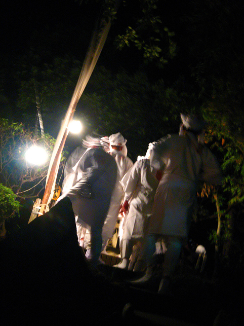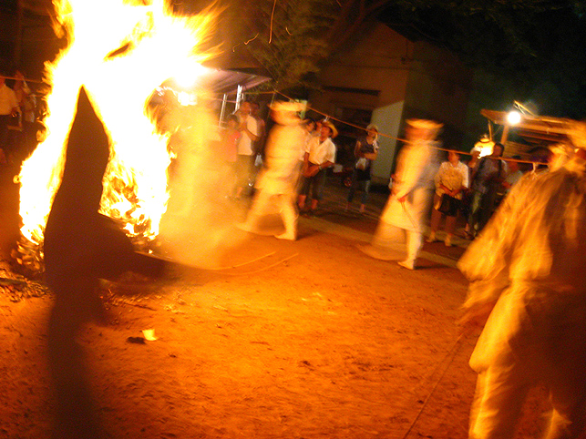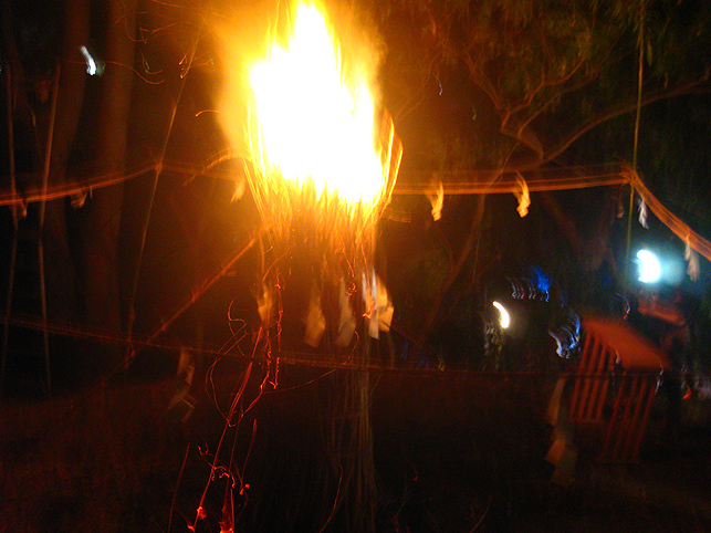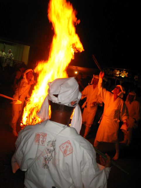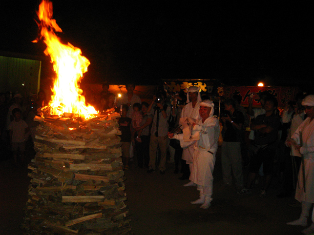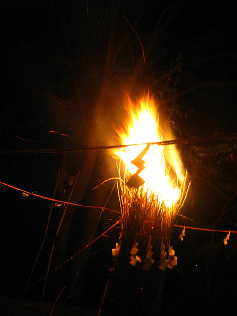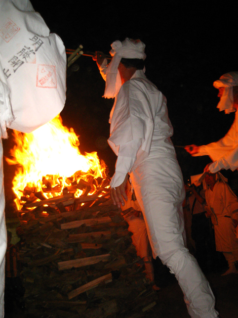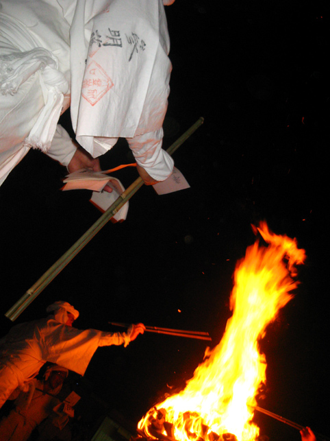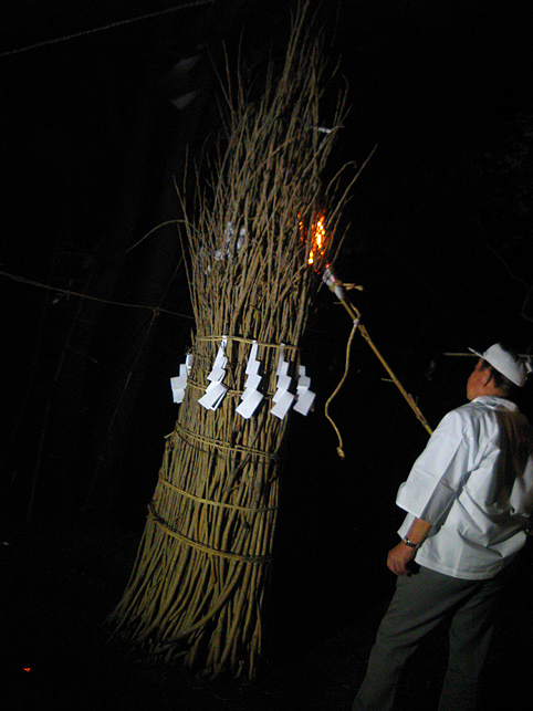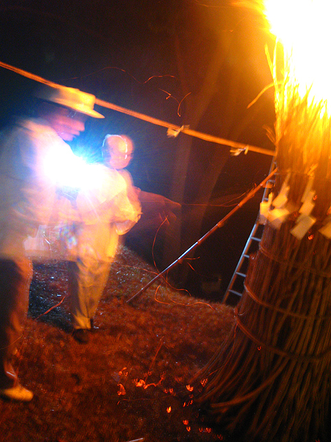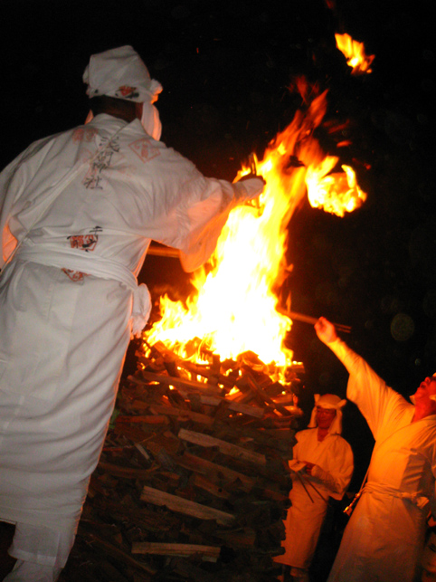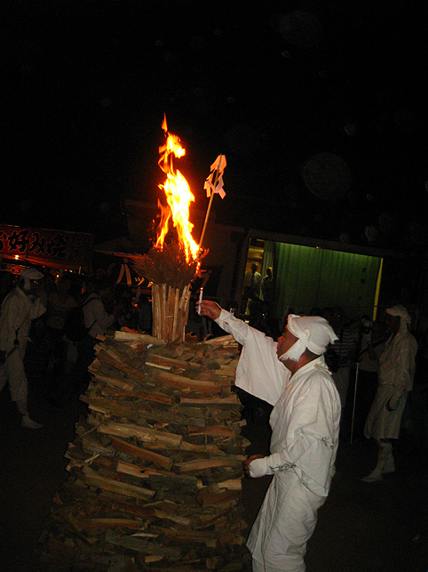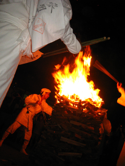 小さい松明が燃えつきると、しばらくして大きい松明での神事です。