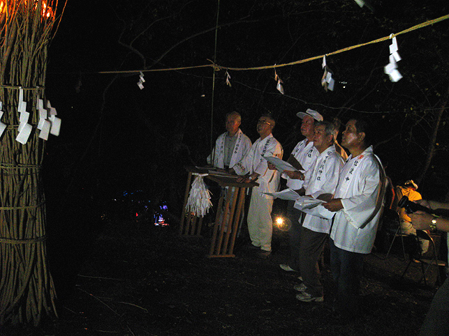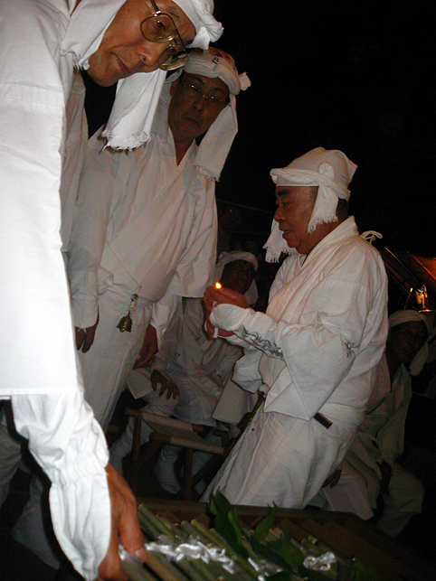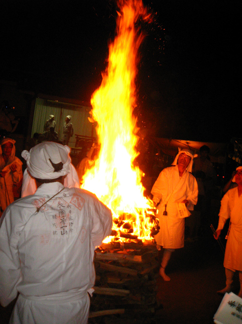 境内に設置された浅間神社の仮宮にて もう一度拝みをします。昨年までは、全員正座をしていたとのこと。膝の痛みを訴える行者が増えたからだそうです。 先達が、お焚き上げのための種火を用意しました。いよいよです。 玉串の向こう側に置かれているのは、竹の箸。60cmほどの長さです。これでお札を挟んで、お焚き上げの火中に放つのです。 焚き上げていただく祈願札は、誰でも納めることができます。 私も願いをこめ、1枚書いてもらいました。 「行者が名前と願い事を読み上げるからね」 「ちょっと恥ずかしいな〜(笑)」 中央の松明に点火すると、乾いた杉の葉はメラメラと火を這わせあっという間に燃え上がりました。 「御願い上げ頼み奉る〜」 まず先達が、ヤマキチ講のお札を竹箸で挟み、読み上げてから火に投じます。 燃えたお札は、火の玉となって上空に舞い上がります。 先達につづき、全員がそれぞれ手に持つお札を焚き上げます。 「おんねがいあげ たのみたてまつる〜。ナニガシダレソレ〜」「おんねがいあげ たのみたてまつる〜。ナニガシダレソレ〜」「おんねがいあげ たのみたてまつる〜。ナニガシダレソレ〜」「おんねがいあげ たのみたてまつる〜。ナニガシダレソレ〜」「おんねがいあげ たのみたてまつる〜。ナニガシダレソレ〜」「おんねがいあげ たのみたてまつる〜。ナニガシダレソレ〜」 燃えた祈願札が高く昇れば昇るほど、願いが叶うと言われます。行者は心をこめ、力いっぱいお札の願主と願い事を読み上げます。 盛り塩は、火力を調整するためのもの。火に投げると少し弱まります。 それにしても、壮絶な火の力。容赦しませんというくらい、火はすべてを焼きつくす。見る者の、心の中の迷いすらも。 滝のような汗を流しながら、12名の行者は力強く願いを言霊に変えてゆく。その声は鈴の音と混じり、すごいパワーを生む。圧巻でした。お寺で護摩焚きを見たことがありますが、その時の何万倍もの感動を受けました。 顔を焼かれ、胸中の暗闇を焼かれ、気づくと私は放心状態になっていました。目から汗も出ていました。 全ての願いを焚き上げて、行者は火のまわりを一周し退場します。 戻って来られた行者のMさんが、 「ほら、こんなに熱くなってる!」 鈴(レイ)を私の手に触れさせてくれました。ずしりと分厚い金剛鈴は、熱と一緒に念を吸ったかのよう。 とにかく金属類はハンパでない熱伝導。同行のカメラマンさんも、カメラが熱くなっちゃって大変だったようです。(そちらの写真は次の本にて♪) 「それからこのお箸!!」 竹箸は、高熱によって彎曲していました。無理はありません。お札を燃やすため、箸ごと火の中に入れるのですから。 お疲れさまでした。離れていてもすごい熱でしたから、火の中に飛びこむほどの位置で読み上げをしていた行者の皆さんは、熱の痛みを体で受けていたのでしょう。それこそ行(ぎょう)として。 それにしても、見事にすべての祈願札を焚き上げられましたね。皆、天に向かって願いが届いたことでしょう。 「お札を書いた人は、自分の札が高く昇ったかどうかとても気にします。ですから、われわれも真剣になるのです」 35年間、このお焚き上げを司ってこられたS先達は、明治18年からつづくこの行事について、いろいろと語ってくれました。ありがとうございました。 人々が去り、静けさが戻った富士塚。 私の感動は、なかなかおさまりませんでしたけど。