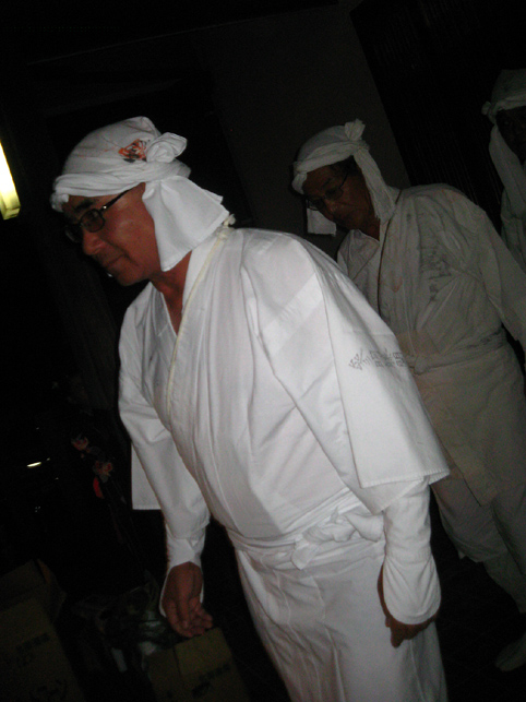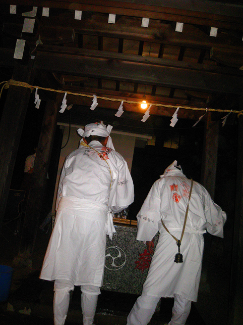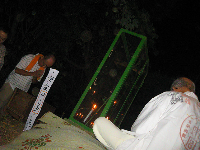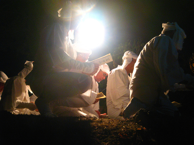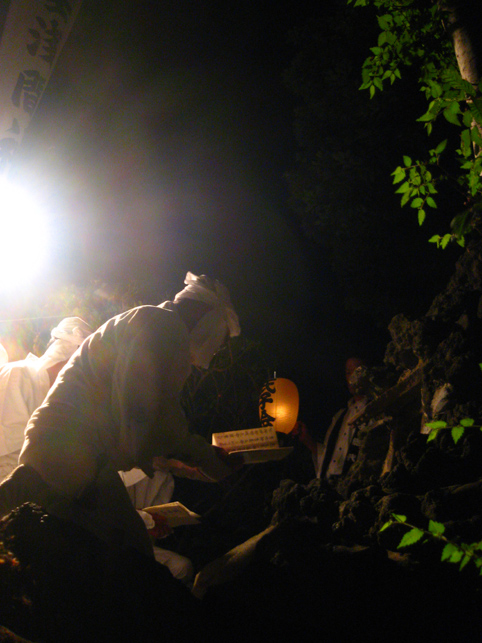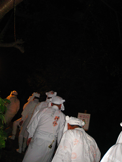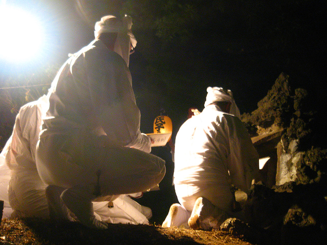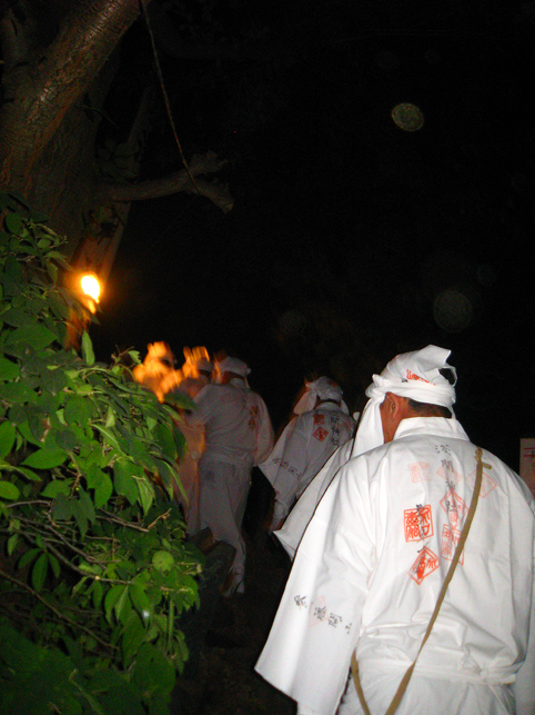 それは、闇の一歩手前。「何か」が始まる予感。「あこうくろう」とも言うね。 ちょっとこわい? そうだよ。現世と過去が交じり合うときだもの。 でも、引き返すにはもう遅い。闇はそこまで忍び寄る。ヒタヒタヒタヒタ。。。 流れて行こう。山の上まで。 水富地区一帯、拡声器によって遠くまで拝みの声が語り響いた。 人々はそれを合図に、富士塚へと登拝を続ける。まるで天空に吸い込まれるかのように。 これはただの祭りじゃあない。過去から、もしくはあの世からやって来る何かとの出会い。 皆、そう心の中で呟いただろう。 声の主は、長老のYさんでした。齢89歳。 富士塚の頂上には、講員が10名。一心に拝みを読誦する。 まるで、呪文を唱えるかのように。 拝みの後、富士講は養蚕神社へ下りました。小さな松明に火が放たれ、ここでも拝みをします。 つづく。。。 |