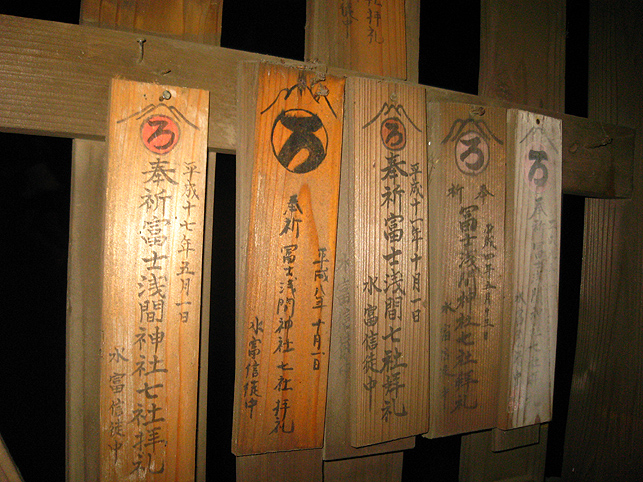 9月1日は、知っているだけでも4か所の富士塚で火祭りがあるのです。 残り3つのうち、今回向かったのは川越の雀ノ森氷川神社。 手についた土を、舐めようとした子供に注意したらこの表情。思わず吹きました♪ 傍にはお焚き上げの松明があります。 木片を積み上げた松明の上には、着火用の杉の葉と細木の束。それに御幣。 広瀬富士のお焚き上げのように、松明を中心に神域が作られていました。 境内の東北に位置する富士塚の頂上から見たところです。 富士塚はとてもシンプル。登るというより、儀式のための構造のよう。 とはいえ、斜面には古い石碑の数々。 松明の近くに浅間神社の仮宮も設えて。 お囃子も盛り上がってまいりました。新宿と書いて「あらじゅく」と読みます。 富士塚のある地域には、お山開きといい火祭り(お山仕舞い)といい、お囃子連が活躍します。それは、単なる町内の祭りでないことのあかし。お囃子は、神様に奉納する意味があるからです。 さて、夜の帳がおりました。 盆踊りも始まりましたね。 氷川神社も浅間神社仮宮も、闇の中で映える時刻。 冨士浅間神社の文字の裏側は、「御水講」。 渋谷の山吉(ヤマキチ)講の枝講で、砂町のオミズコウともファミリーですね。 でもここでは「おんみずこう」と呼ばれます。 お焚き上げの始まる8時にはまだちょっと時間がある。もう一度、富士塚に登ってみよう。 目の前を、数人の子供達が駆け登って行きました。 「写真、撮って。撮って〜!」 彼らは、慣れたように奥宮によじ登り、はしゃいでいました。 しょうがないなぁ。 「ここには富士山の神様がいるんでしょ?」 「うん!」 「普段は乗っていないよね?」 「うん!」 「じゃ、いっか。今日はお祭りだからね〜」 考えてみたら、彼らはこの地で「安産祈願」をもって生まれ、「初山参り」で祝福された子供たちなのです。富士山の御加護をいただいている彼らは、こうして富士山と戯れて育つのでしょう。 いい子たちでした。 別れ際、 「ありがとうございました。盛り上がりました!」 なんて、お礼を言われた時には笑ってしまいました〜♪ あ、気づくともう8時。 行者たちは出番待ちです。 つづく。。。