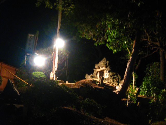 通常、14〜15名が揃うのですが、今年はふたりの方がブク(忌服)といって身内に御不幸があって不参加でした。 まず、彼らが向かったのは手水舎。 全員が順番にお浄めした後、 富士塚に登拝します。 小さい塚なのに、まるで山道に見えるのはなぜでしょうか。 まだ明るいうち、風が強くて木々にかかっていた幟は、 きれいに降ろされて、闇の中で光を浴びていました。 行者たちは、狭い頂上の奥宮に向かって場をとる。 先達を先頭に、しゃがみ込むと 拝みが始まりました。 幻想的な時間です。 全員で読むお伝えは、高き山の頂きから流れ聞こえるものと変わりない。 お焚き上げをするためにすること。 禊をし、富士塚に神を降ろし、その神気を体に蓄える。 私はそう感じました。 つづく。。。