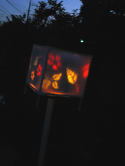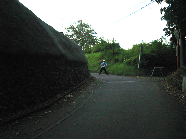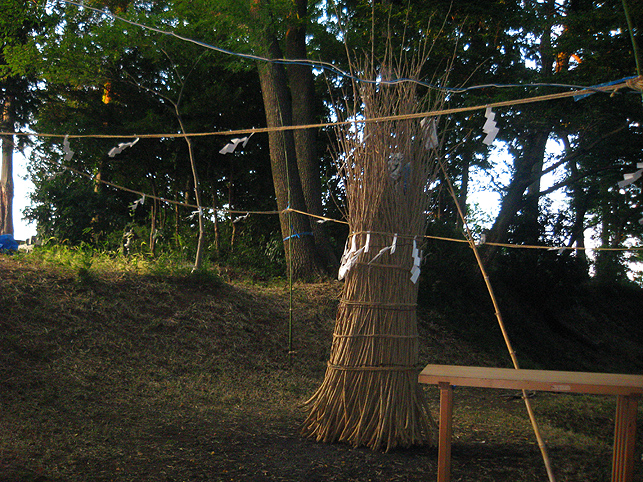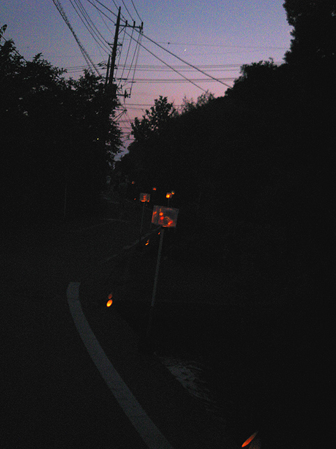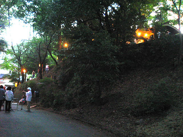 地名は上広瀬と言いますが、このあたりは昔から「水富」と言われています。 襷坂の横に、富士塚の登山口があります。 河岸段丘は、長い帯になって続いています。富士塚はこの高台の上に土を盛られて造られました。 「その昔、じいさんのじいさんたちが土を運んで造ったんです」 と、富士講の方。結構古いです。 地形を見るために歩きまわっていたら、交通規制を担っていたガードマンが、ストレッチしていた(笑)。 以前から気になっていたこの広瀬富士は、こんな感じ。 左の中腹にある、養蚕神社の前に小さい松明。 右側には庚申堂があり、その隣に大きい松明が出番を待っていました。 いずれの松明も、桑の枝をくくってできています。吉田の火祭りの松明によく似たカタチですね。大きい松明は、注連縄で張られた神域の中央に。 空の色が変わり、無数の蝙蝠が飛び始めました。 塚の南側を流れる堀(水路)に沿って、色鮮やかなぼんぼりが回っていました。 と、拝みの声が聞こえてきました。 つづく。。。