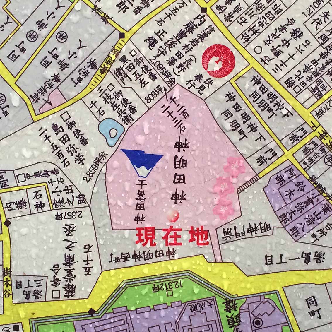 江戸は天保年間(天保8年以前)の築造と言われていますが、詳細は知られていません。 (境内にある獅子山は富士塚ではありません) 雨降る過日、神田明神を訪れてみました。 神社には「神田富士」が描かれた江戸切絵図と現在地の看板がありました。 それを手がかりに歩いてみたところ、 神社の西側に隣接する「宮本公園」が「神田富士」の跡地であるとわかりました。 中央の遊具に登ってみました。 遊具の頂上から目線を延ばすと、延長線上に下り坂が続いています。 この方向に富士山があるのではないか?と思って コンパスで調べてみたところ、方角は北西。 残念ながらその先に富士山はありませんでした。 看板の方位が、上が北でなかったので、予測方位を間違えました。 遊具を降りた時、傍らの植込みに気づきました。 あくまでも直感ですが、ここが神田富士の山麓だったのではないか という印象を得ました。 現在、宮本公園は整地され真っ平らになっていますが、 この植込みの南西側は斜面の頂上で、 コンパスによればその延長上に富士山があります。 たぶん、このあたりに「神田富士」があったと思われます。 宮本公園を訪れる機会がありましたら、ぜひこの地形をチェックしてみてください。 Facebook あり〼 |