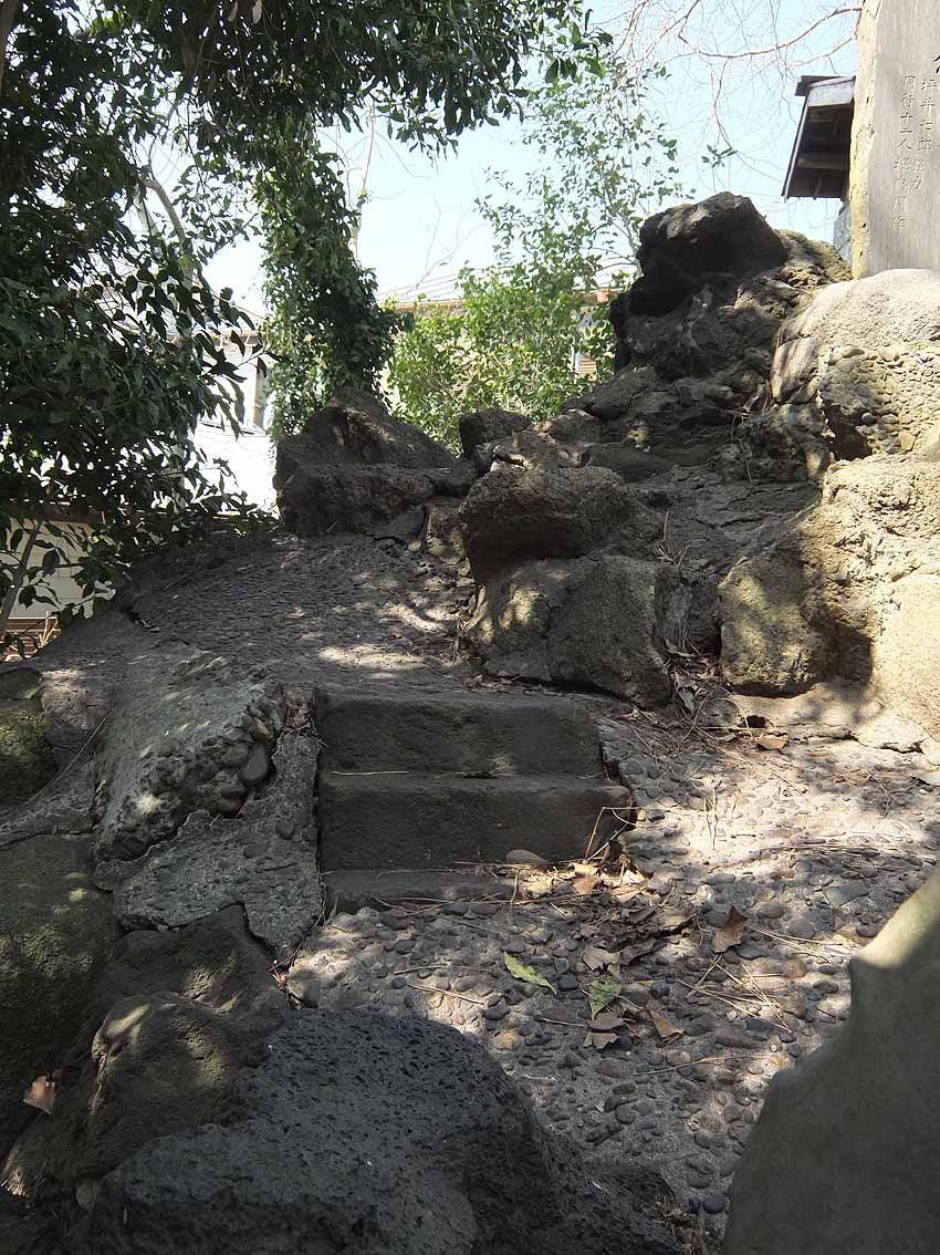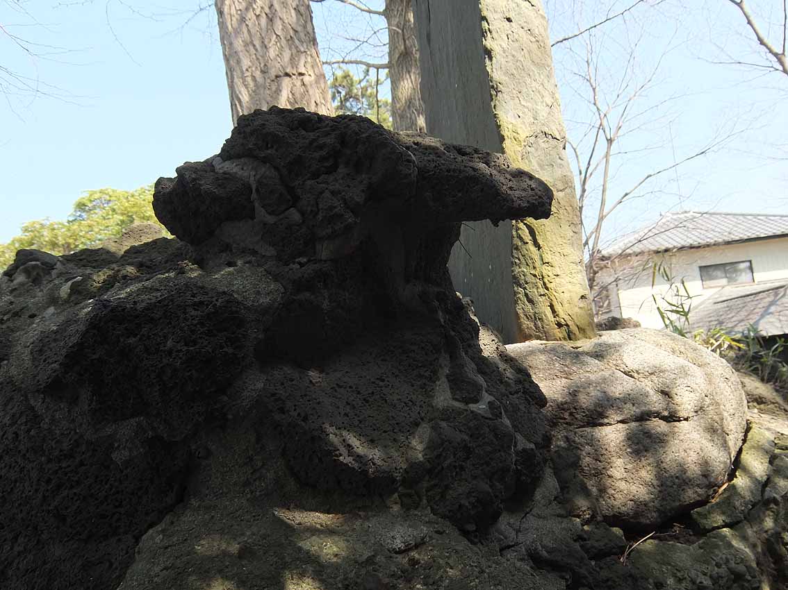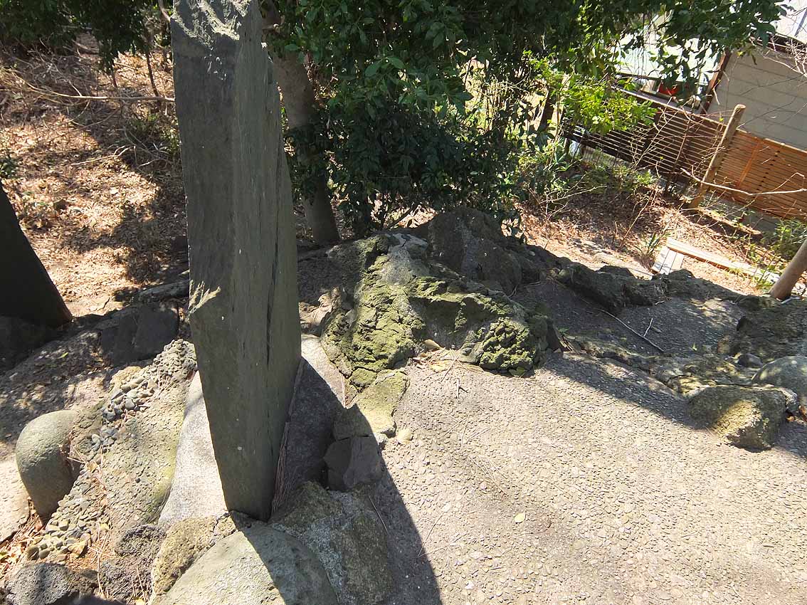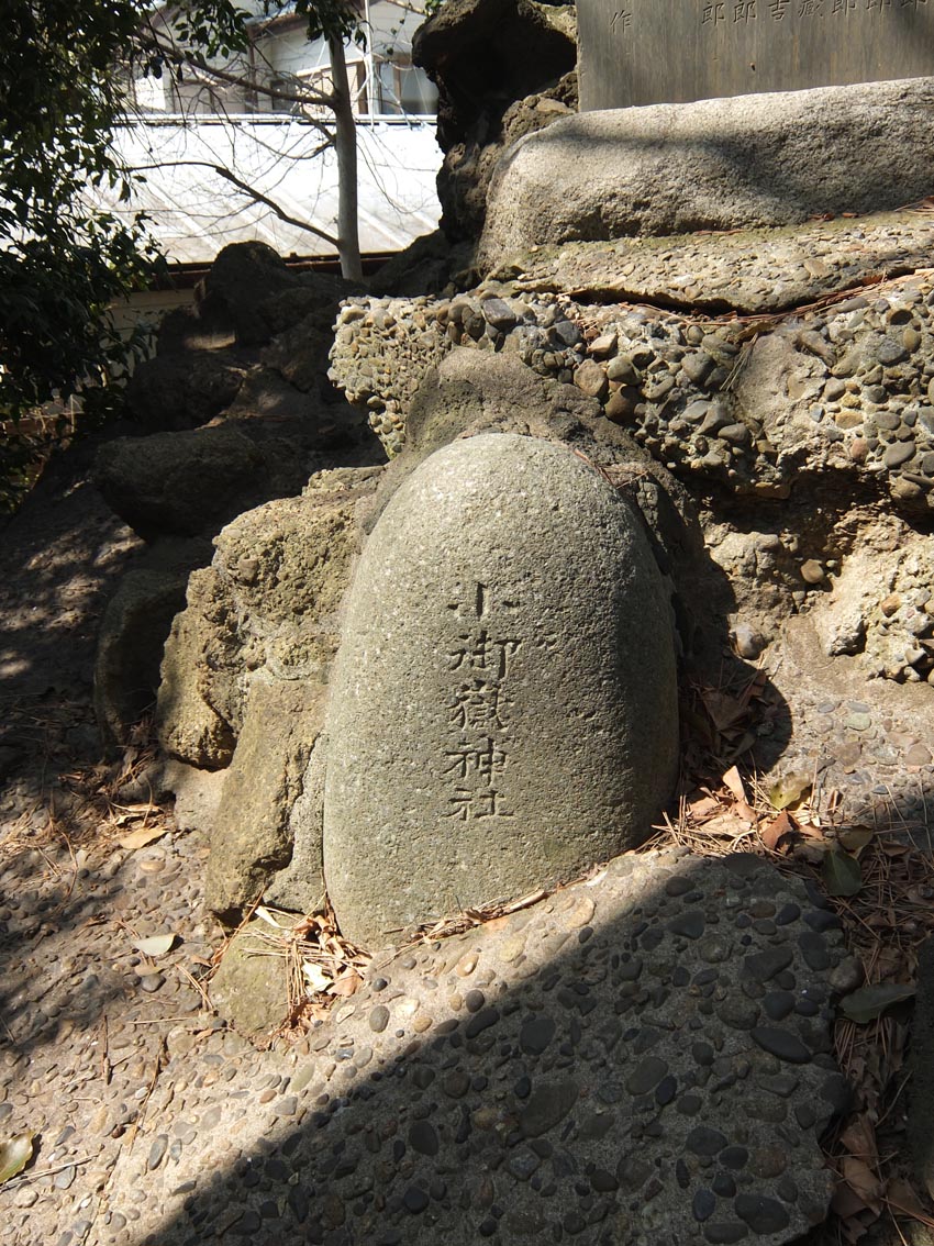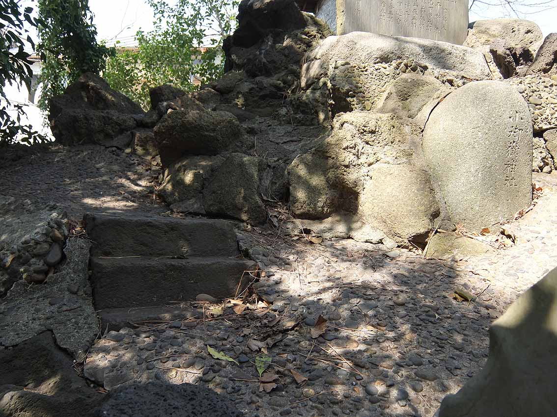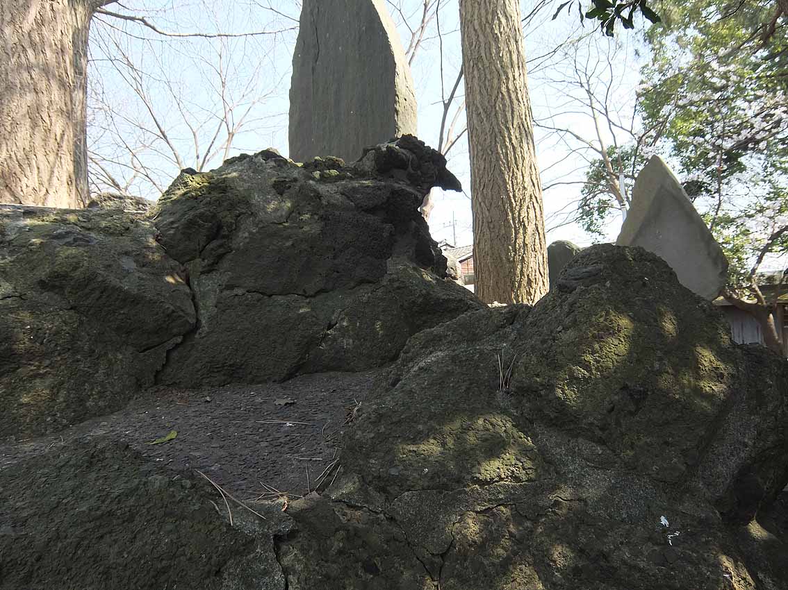鳥居をくぐって後ろを振り返ると、参道が長く続いているのが見えます。 京成線の電車が通り過ぎました。 狛犬の土台にたっぷりの溶岩。 拝殿の左手前に神輿殿。境内のずっと奥、中央に富士塚が見えます。 神輿殿の扉のすき間から、蕨手(わらびて)が見えました。 小さな富士塚は、ひっそりと太陽の光を受けていました。 小さいながらも、登拝の石段はきっちり。 下の記事に書いた、猿の指した不二講の不の文字。 中腹、右側に人がひとり立てるくらいの平らなスペース。富士塚には、しばしばこうして講碑を拝むようにしたであろうスポットがつけられています。 頂上の奥宮はブロックで固めた簡素なものですが、中には表面が剥離した碑が。 頂上は平らで安定感があります。 訪れる人はおそらく中央の石段だけを昇り降りすると思いますが、この小さな塚はちゃんとレイヤーになっていて、下山道がうっすら残っています。 おそらく修復した際に、この下山道はもういらんねとセメントで固めてしまったのでしょう(塚の左側は民家の庭になっていて、足を踏み外すと庭までまっしぐらに滑落しそう)が、石段が3段ほど残っています。 こうした「やっちまった感」のある痕跡は私の好物。実は、雑な修復ほどいろいろな発見ができて面白い。 明治の築造だろうが、のちの人がその時の都合でいろいろ変えちゃう。私は、地元の人が信仰する便宜があればそれでよいと思っています。うまい修復、ヘタな修復、いろいろあるけど、まるごと受けとめることこそ、彼らの信仰をリスペクトしていることにほかならない。そもそも富士塚は、地元の人のために造られたものであって、学術的にどうのと考えるのは現代人の思い上がりなのです。 3段の右側には、小御嶽。 講碑群の間からも、ちんまり見えます。 もうひとつの面白さは、頂上付近のカラス。 本当に、千葉県にはこうしてボク石を丁寧に(セメントで固めて)尖った形状にしたものが多い。特に多いのが不二講が造った塚です。フシギですねぇ。 Facebook あり〼