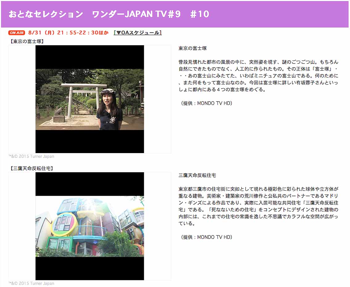 同日放映されたのは、三鷹天命反転住宅でした。これは、故 荒川修作氏による「死なないための住宅」です。ちなみに私は3年前、同氏の養命天命反転地へ赴き、まるで富士塚のような作品に出会い、感銘を受けました。 Facebook あり〼