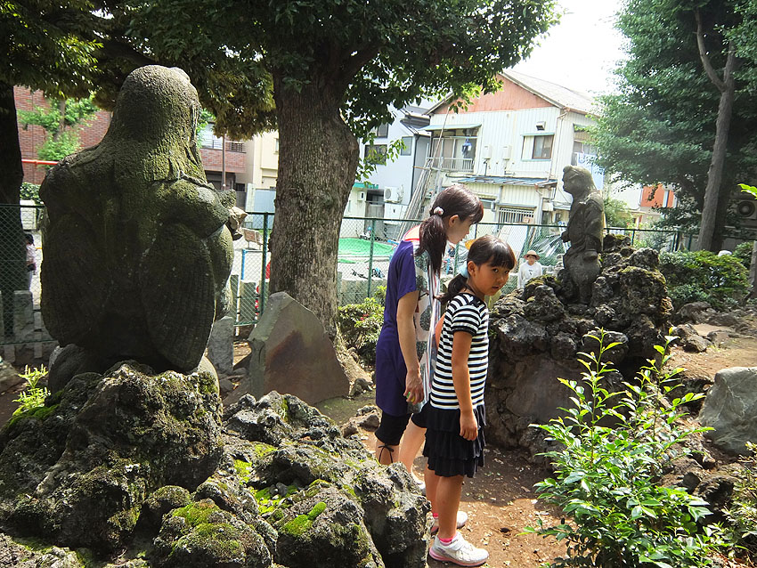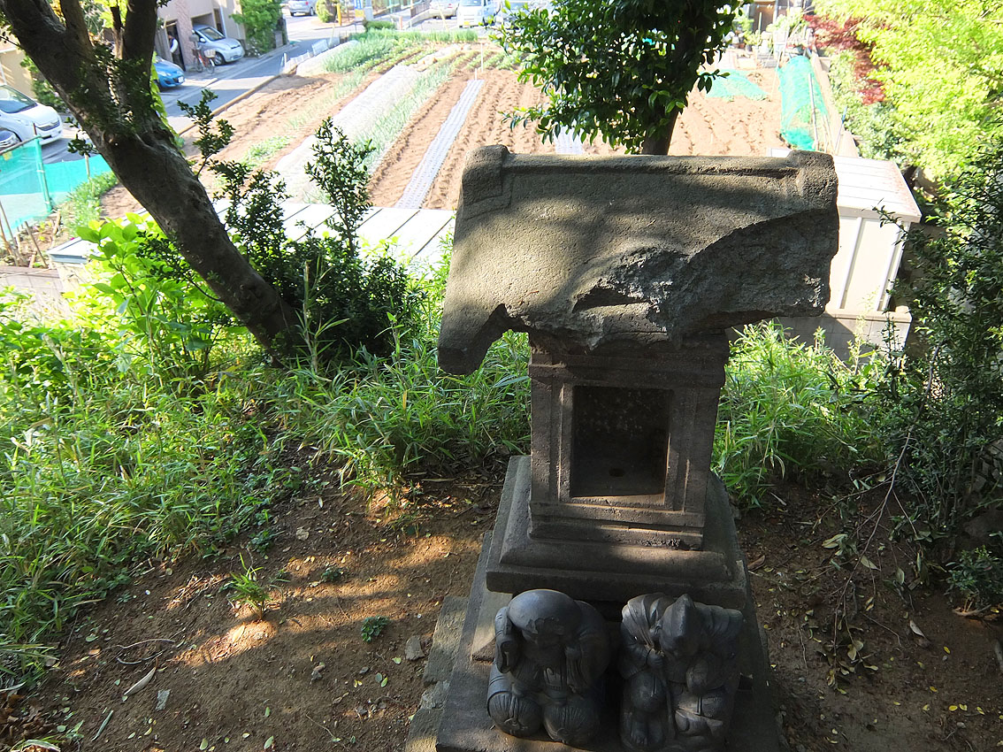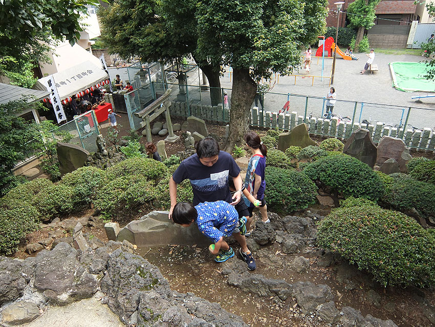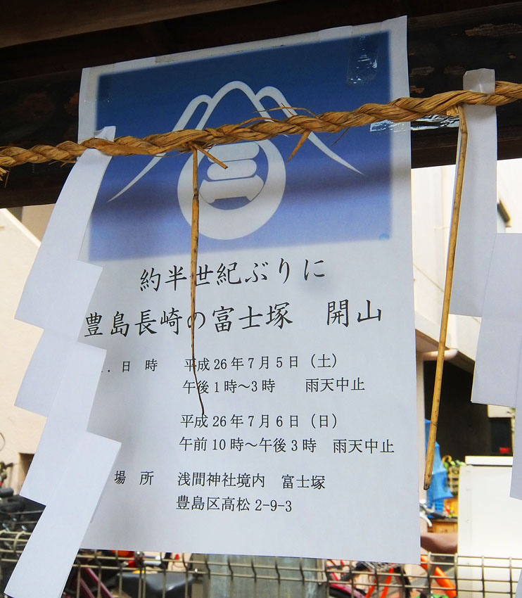 豊島区高松の高松富士(長崎富士とも言います)。 4基ある国指定重要有形民俗文化財の富士塚のうち、今まで、 ●高松富士:年間立ち入り禁止 ●木曽呂富士:常時登拝可能 ●江古田富士:年3回(正月3が日と7月1日と秋の例大祭の2日間) ●下谷坂本富士:年2日(6月30日と7月1日) でしたので、今回の高松富士の公開は快挙です。だって、ほぼ半世紀ぶり! 塚の入口は公園の東側。フェンスの扉が開いています。 まず、浅間神社にお参り。月三講の額が掲げられていました。 講名は講祖である三平信忠の「三」を取ってつけられたそうです。 フェンスの中に入り、塚に一歩近づいただけで空気が一変しました。 久しぶりに感じた清涼感でした。 そしてすぐに目が合った。 烏天狗と 大天狗に。 小御嶽神社への案内人、大小天狗に「のちほど!」と声をかけていると、 子供たちがすばしっこく登山道を駆け上がって行きました。 烏天狗の横を通って、私も登拝することに。 登山道は、平坦なところもあるけど 8合目あたりから急に傾斜をつけてあります。富士山特有のカーブを表すためでしょう。 日御子碑も見えます。 頂上でゲームに勤しむ、今どきの子ら。 祠の中には11代目の先達、本橋源蔵が納めた大日如来像が。 塚の前面を振り返ると、 登拝中の親子。このあたりは段差が大きいので、子供にはちょっとキツい。 でも、最後の数歩はこんな作りになっていて、安全です。 中腹で小御嶽をお参りする女性が見えました。 一旦下山し、 天狗のあたりから小御嶽道を行く。 さて、麓まで下山し前面を通ります。 高さ8m、径21mの高松富士は、月三講による築造(文久2年)と言われていますが、 これが文久2年と刻まれた講碑。 そのまま塚の西側を歩いて北西部。 親子が「小さなおうち」と呼んで中を覗き込んでいたのは 御胎内です。一枚岩で覆われているので、乗っても安全でした。 大型塚で麓を一周できるのは、そうそうないです!素晴らしい。 中道もくっきり。その先には天狗の後ろ姿! 表に回ると、 「ふうん。大天狗と烏天狗は大正6年に奉納されたんだって」 「私たち、天狗ににらまれてない?」 社殿前で、お囃子が始まりました。 最後に猿像。 池袋富士の猿に似て、対に見えますが、 右は鳥居の近くにいた猿(元々塚にいた)で、 左は地元住民の家にあったものを奉納とのこと。 とにかく、初めての高松富士登拝ができ、富士講と保存会の皆様に感謝です。 塚の構造から、こだわりカーブのつけ方、ダイナミックな登山道、 たっぷりのボク石、おびただしい数の講碑と石像物、そして塚一周できる点、 などなど、すべてが素晴らしいものでした。 また、子供や若い方たちが楽しそうに登っていましたが、 ご年配方が、感激しながら登拝されていたのが印象的でした。 「むかーし、登ったことはあるよ。公園は神社の境内だったからねぇ」 「あたしは初めてよ。50年くらいここに住んでいるのに」 「ああ、あんたはお嫁に来たからね」 フェンス越しに「私も登りたいよう」と言っている方もいました。 ★来年以降も登れることになっています。お楽しみに! (7月第1土日です。7月1日が日曜の場合は、6月30日から解放とのこと) Facebook あり〼