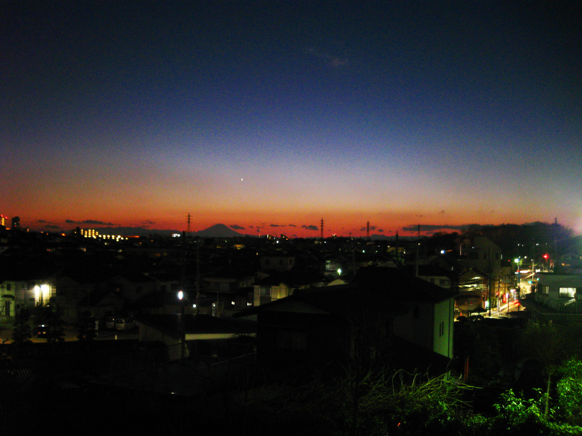 今は八坂神社境内の木々に遮られ、富士塚から富士山は臨めませんが、 どうぞがっかりしないで! 「大泉富士」から、真西80mに「風の丘公園」があります。 ↓展望台からの眺めがこちらです!(2014年元旦の画像) 富士塚とほぼ同じ高さ&同じ方角にある、この高台からの眺めは、 かつて大泉富士から遥拝できた富士山の姿と同じはず。 大泉富士に訪れたら、ぜひ、風の丘公園にもお寄りください。 ★確か昨日(7日)あたりに、ここからダイアモンド富士が拝めたと思います♪ Facebook あり〼